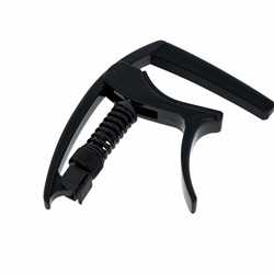 The NS Tri-Action capo in black assures buzz-free, in-tune performance at any fret. The patent-pending Tri-Action geometry reduces the force required to open and close the capo and applies even tension regardless of neck profile. Combined with the micrometer tension adjustment and direct horizontal pressure, the Tri-Action Capo virtually eliminates pulling the strings side to side and the need to retune during use. Additionally, the lightweight aluminum construction adds negligible weight to the neck of the instrument. The capo features an integrated pick holder and is a Ned Steinberger design.